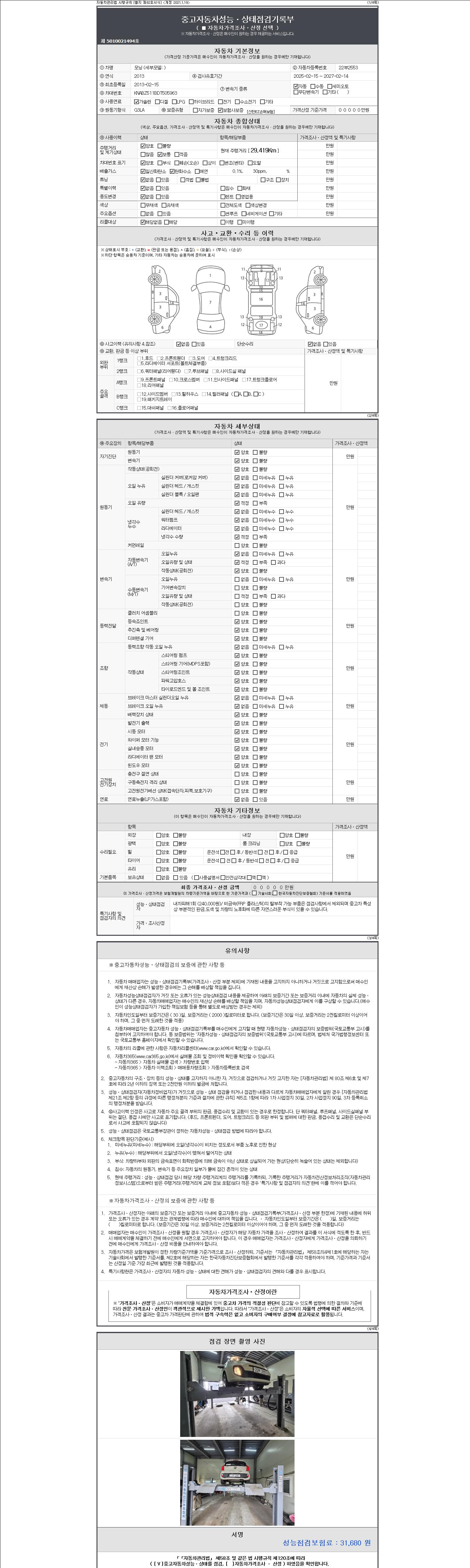 -중고자동차 매매업자를 통해 차량을 구입하실 경우 반드시 "중고자동차 성능, 상태점검 기록부"를 교뷰 받으셔야 하며, 매매업자는 반드시 의무 교부 하여야 압니다.