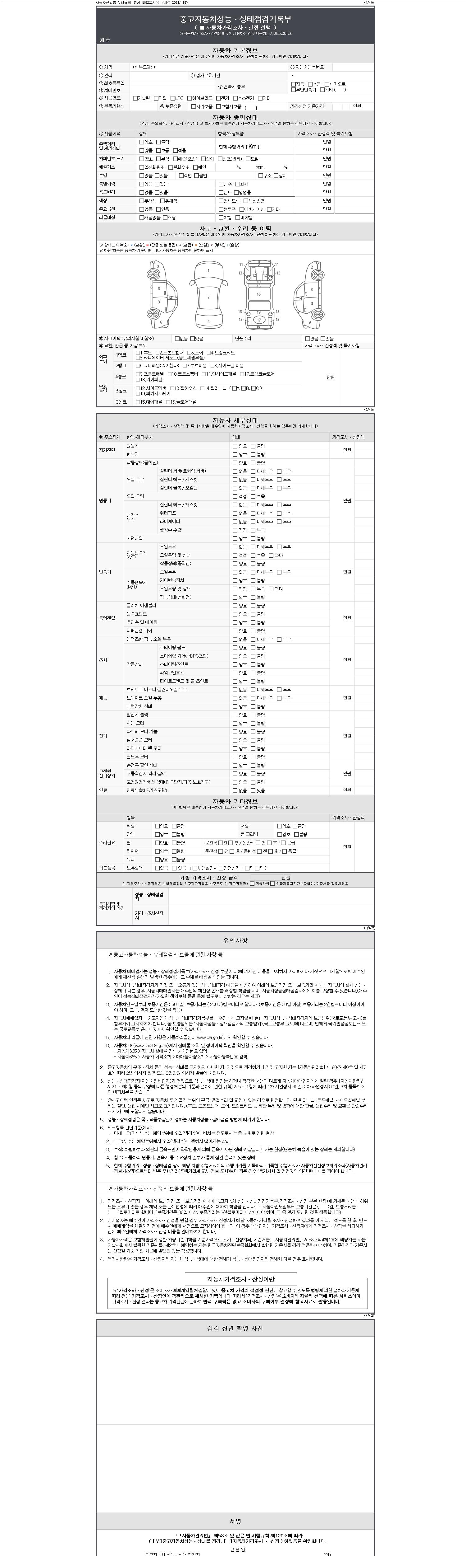 -중고자동차 매매업자를 통해 차량을 구입하실 경우 반드시 "중고자동차 성능, 상태점검 기록부"를 교뷰 받으셔야 하며, 매매업자는 반드시 의무 교부 하여야 압니다.