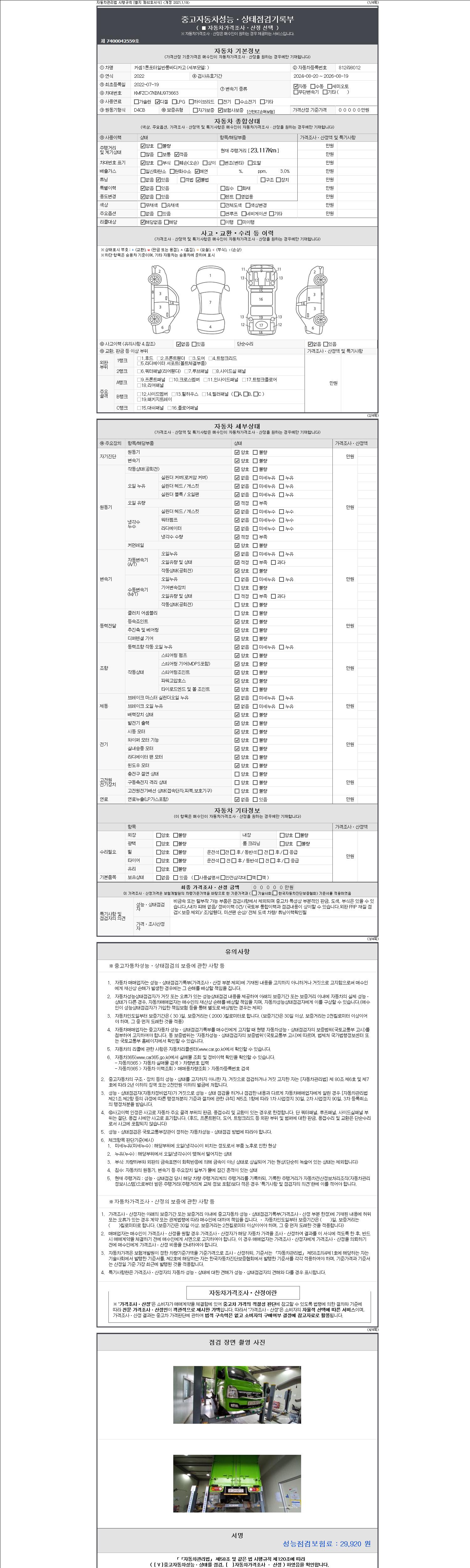 자동차관리법 시행규칙 제120조의 규정에 따라 별지 제 82호서식 《중고자동차 성능, 상태점검 기록부》를 발행한 성능, 상태점검자 및 매매자는 아래의 보증기간 또는 보증거리 이내의 중고자동차, 성능점검 기록부에 기재된 내용과 자동차의 실제 성능, 상태가 다른 경우 계약 또는 관계법령에 따라 매수인에 대하여 책임을 집니다.