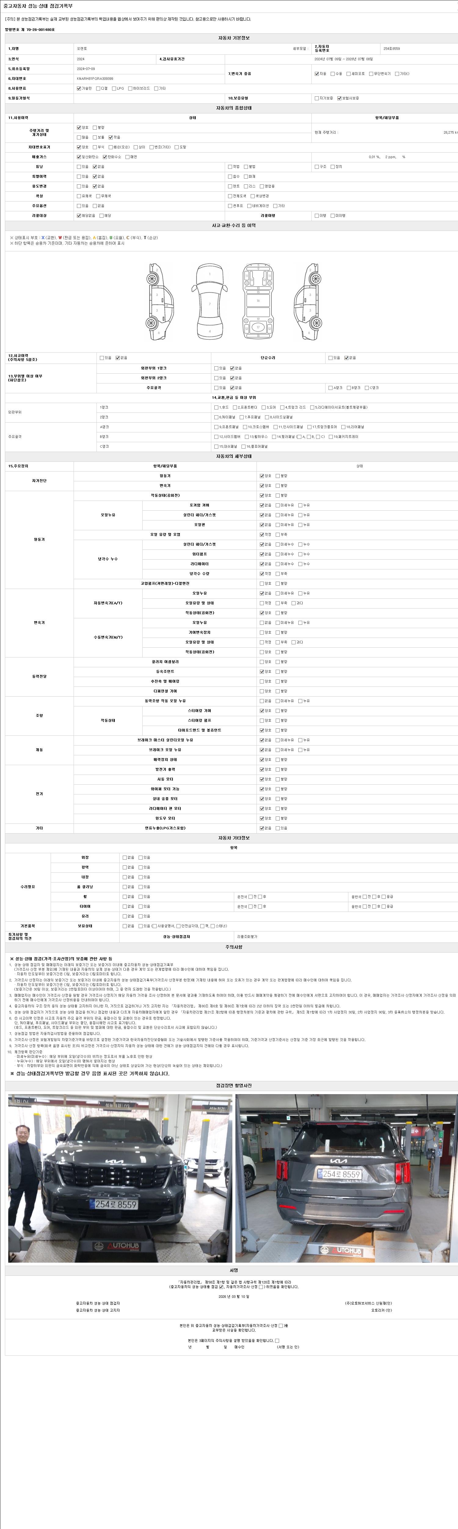 | 주행거리 | 26,275 km | 차량번호 | 254로8559 | 사고유무 | 성능기록부 참조 | 제시번호 | 제 2147483647 호 |