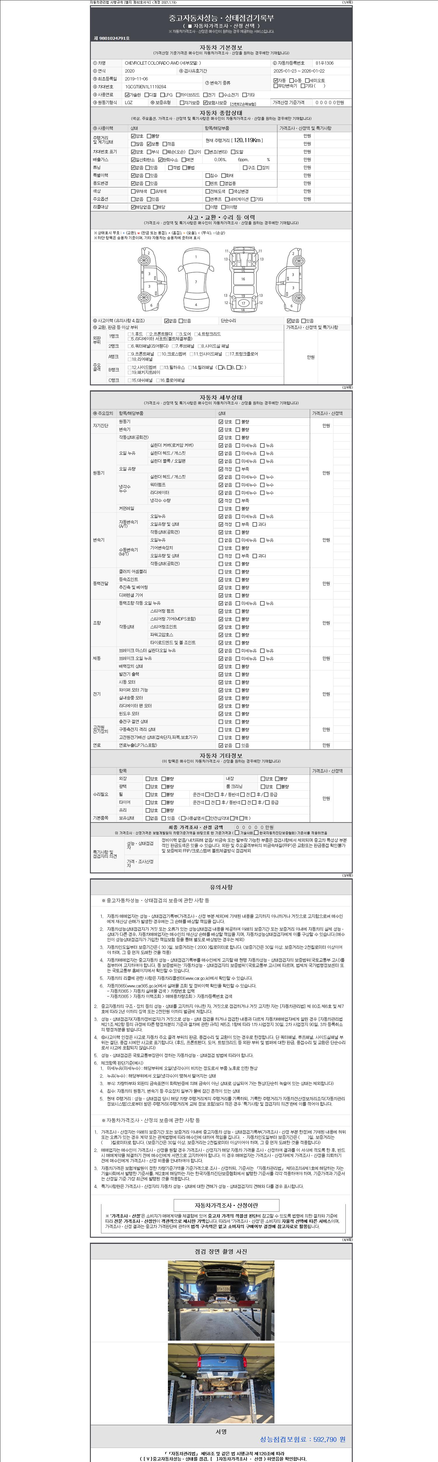 자동차관리법 시행규칙 제120조의 규정에 따라 별지 제 82호서식 《중고자동차 성능, 상태점검 기록부》를 발행한 성능, 상태점검자 및 매매자는 아래의 보증기간 또는 보증거리 이내의 중고자동차, 성능점검 기록부에 기재된 내용과 자동차의 실제 성능, 상태가 다른 경우 계약 또는 관계법령에 따라 매수인에 대하여 책임을 집니다.