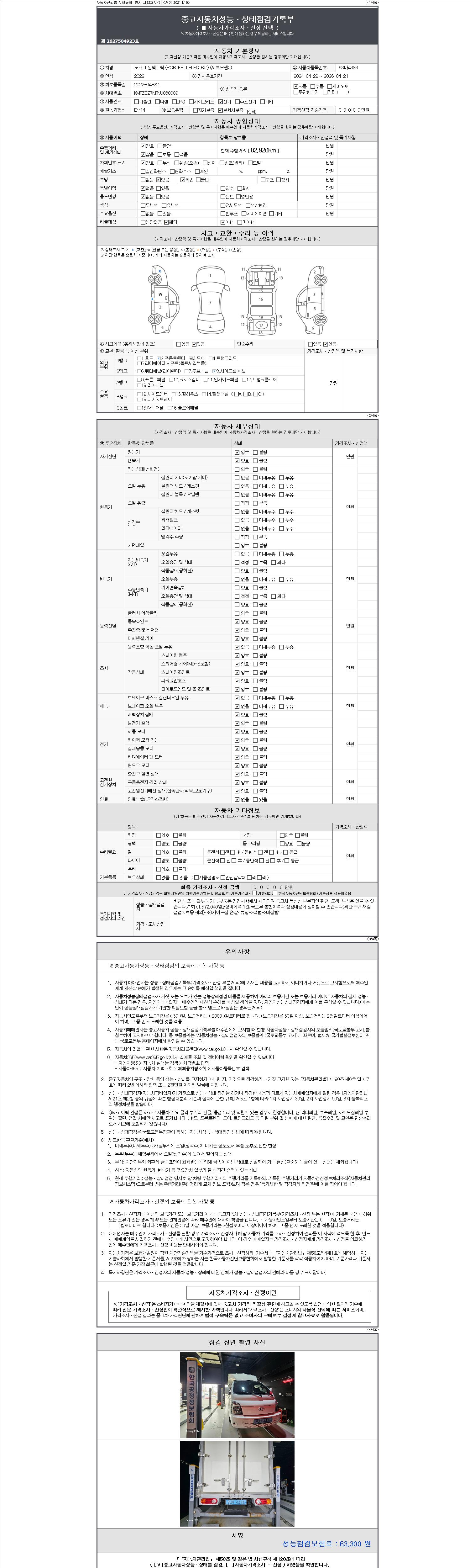 자동차관리법 시행규칙 제120조의 규정에 따라 별지 제 82호서식 《중고자동차 성능, 상태점검 기록부》를 발행한 성능, 상태점검자 및 매매자는 아래의 보증기간 또는 보증거리 이내의 중고자동차, 성능점검 기록부에 기재된 내용과 자동차의 실제 성능, 상태가 다른 경우 계약 또는 관계법령에 따라 매수인에 대하여 책임을 집니다.