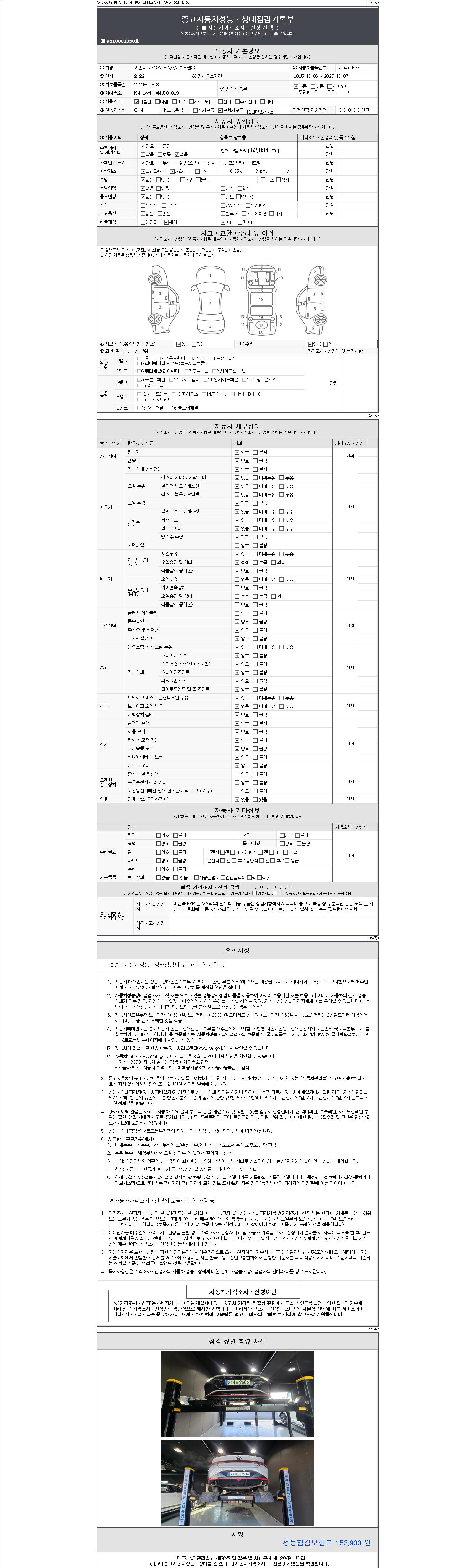자동차관리법 시행규칙 제120조의 규정에 따라 별지 제 82호서식 《중고자동차 성능, 상태점검 기록부》를 발행한 성능, 상태점검자 및 매매자는 아래의 보증기간 또는 보증거리 이내의 중고자동차, 성능점검 기록부에 기재된 내용과 자동차의 실제 성능, 상태가 다른 경우 계약 또는 관계법령에 따라 매수인에 대하여 책임을 집니다.