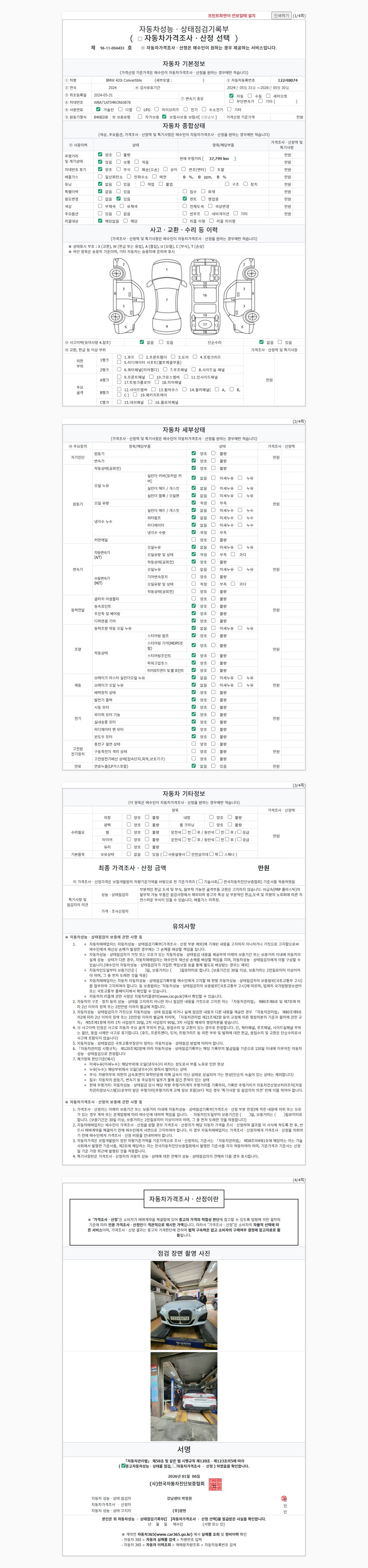 | 주행거리 | 37,500 km | 차량번호 | 122서8074 | 사고유무 | 성능기록부 참조 | 제시번호 | 제 2025178567 호 |