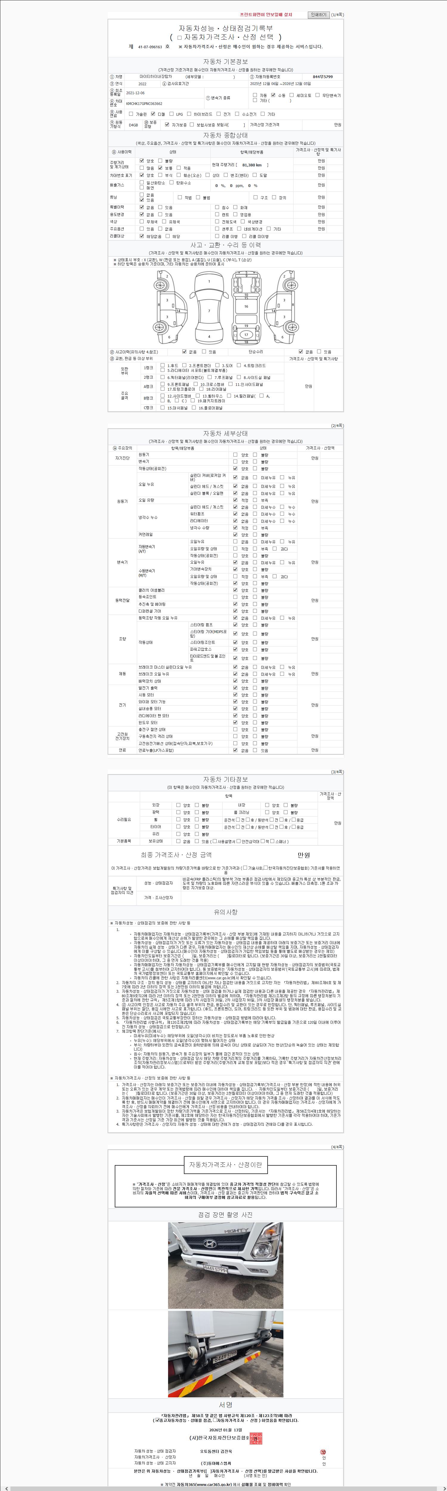 자동차관리법 시행규칙 제120조의 규정에 따라 별지 제 82호서식 《중고자동차 성능, 상태점검 기록부》를 발행한 성능, 상태점검자 및 매매자는 아래의 보증기간 또는 보증거리 이내의 중고자동차, 성능점검 기록부에 기재된 내용과 자동차의 실제 성능, 상태가 다른 경우 계약 또는 관계법령에 따라 매수인에 대하여 책임을 집니다.