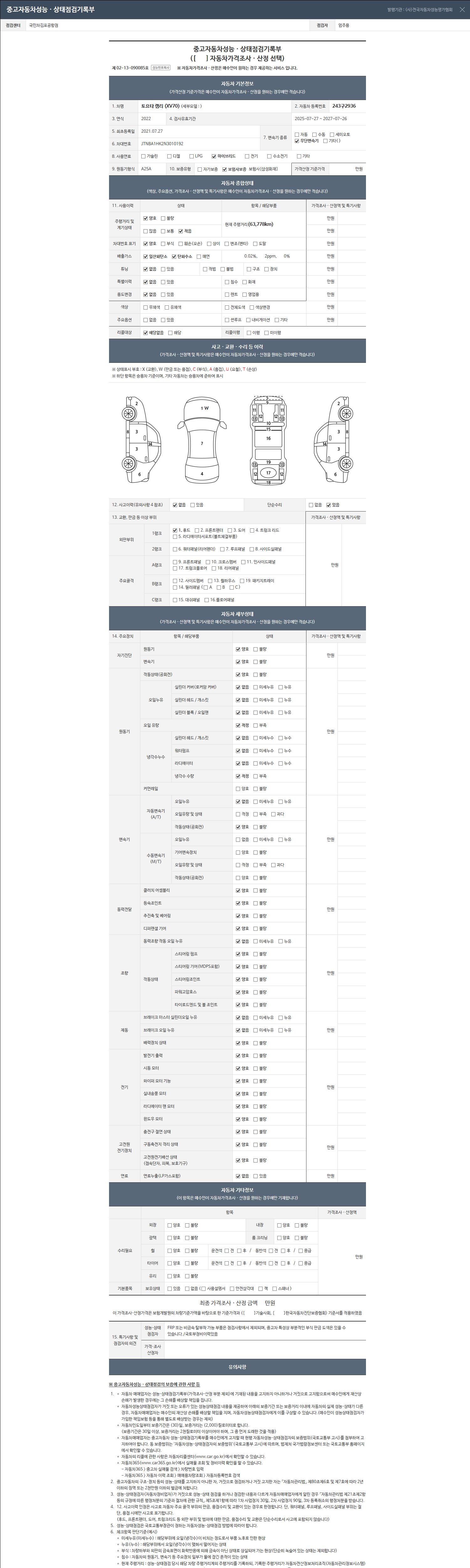 - 2. 차량 등록증이나 성능점검지 등을 상담자에게 요청및 확인하시고 사전에 미리 점검 하시기를 권유드립니다.