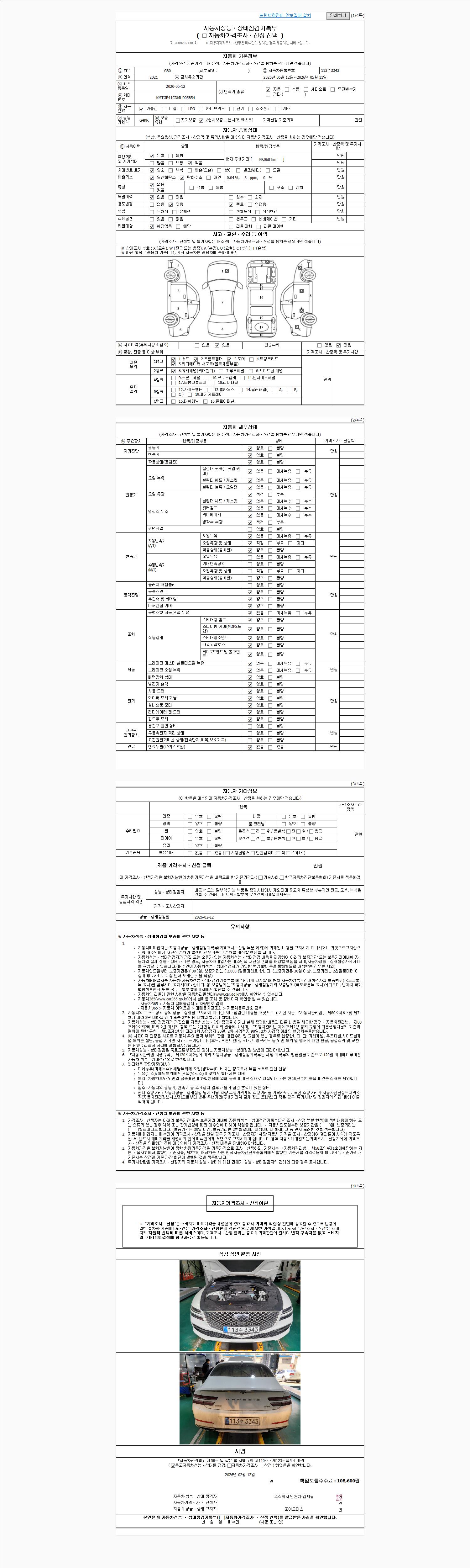 | 주행거리 | 90,000 km | 차량번호 | 113수3343 | 사고유무 | 성능기록부 참조 | 제시번호 | 제 2026008342 호 |