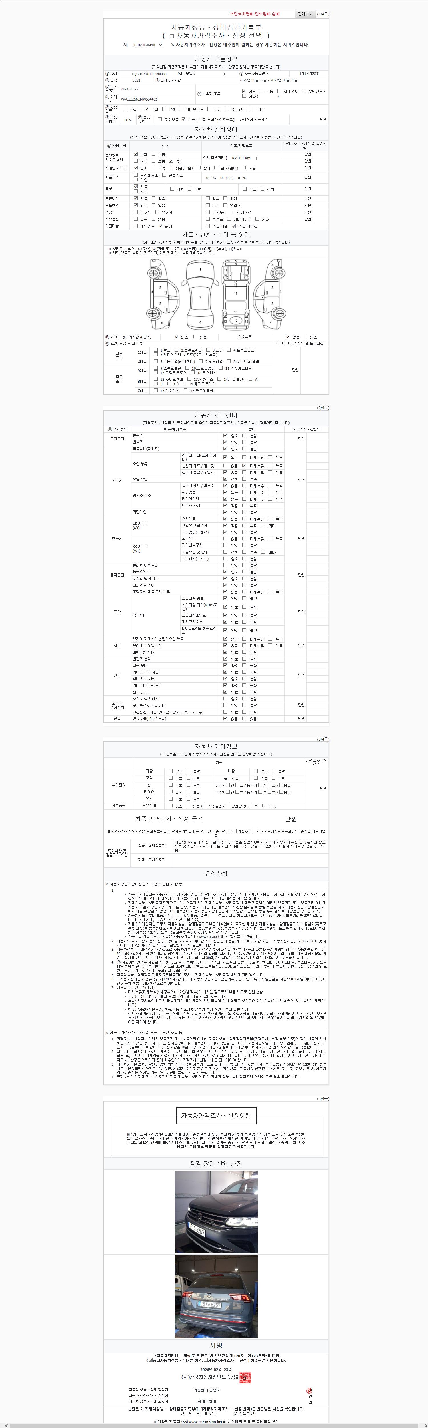 자동차관리법 시행규칙 제120조의 규정에 따라 별지 제 82호서식 《중고자동차 성능, 상태점검 기록부》를 발행한 성능, 상태점검자 및 매매자는 아래의 보증기간 또는 보증거리 이내의 중고자동차, 성능점검 기록부에 기재된 내용과 자동차의 실제 성능, 상태가 다른 경우 계약 또는 관계법령에 따라 매수인에 대하여 책임을 집니다.