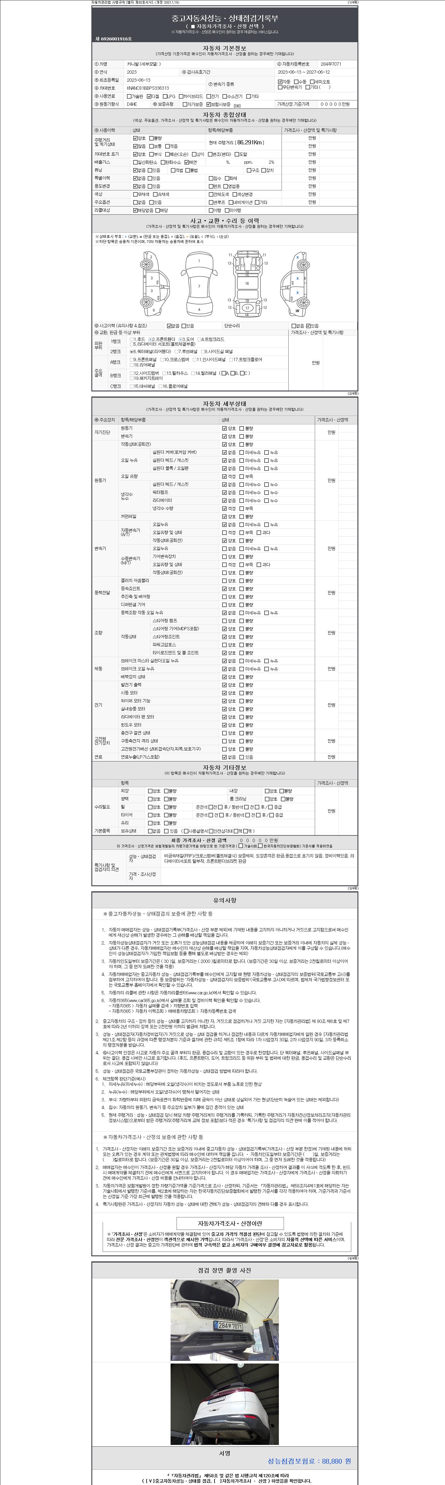 | 주행거리 | 86,291 km | 차량번호 | 284무7071 | 사고유무 | 성능기록부 참조 | 제시번호 | 제 2147483647 호 |