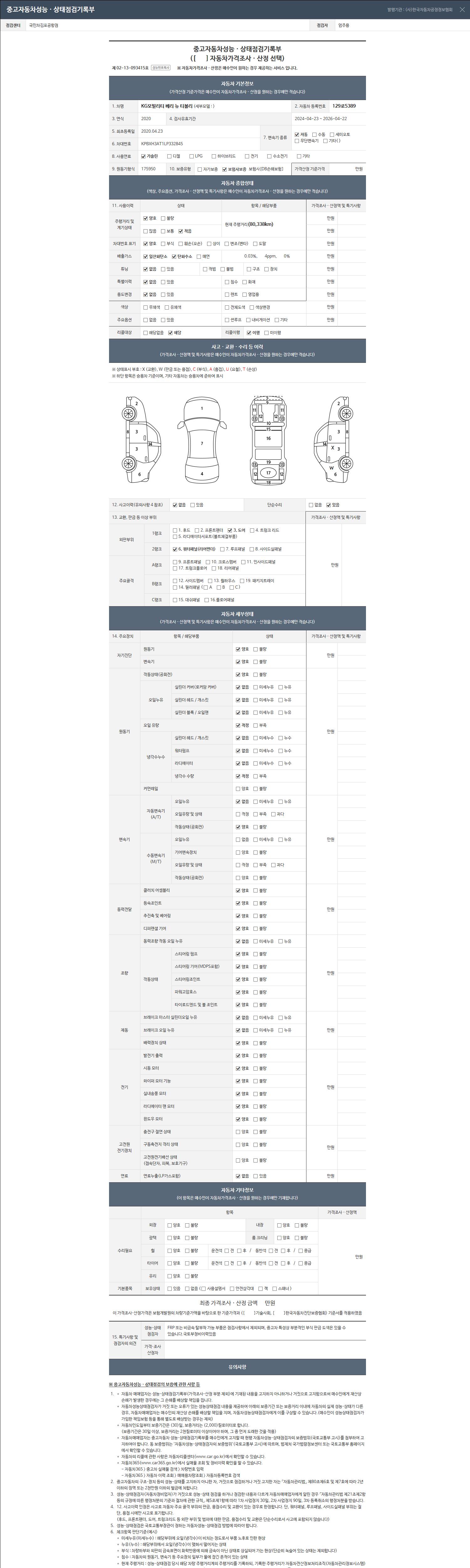 | 주행거리 | 80,338 km | 차량번호 | 129로5389 | 사고유무 | 성능기록부 참조 | 제시번호 | 제 2026050031 호 |