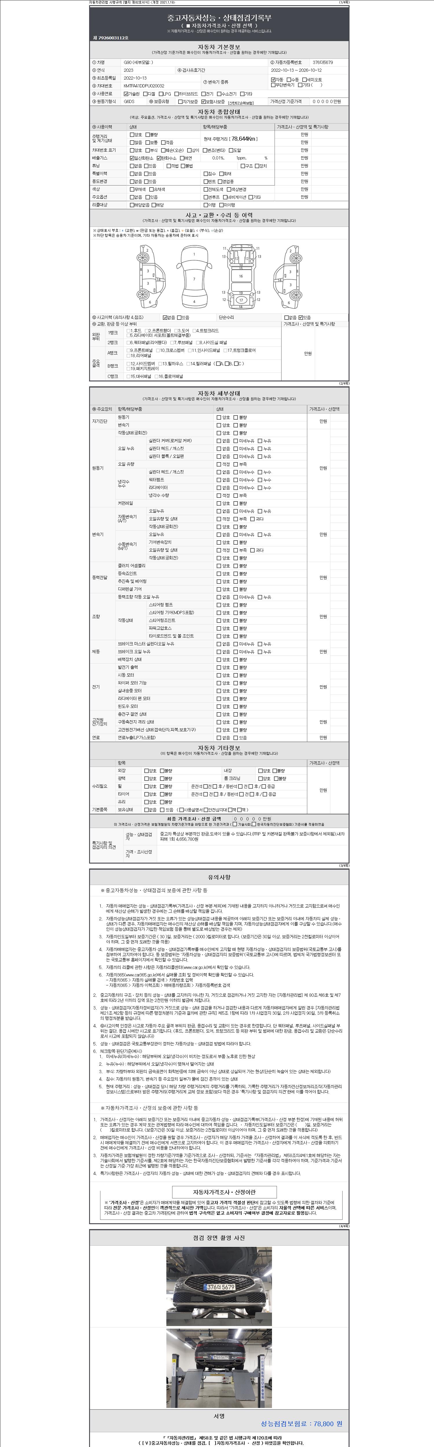 | 주행거리 | 78,644 km | 차량번호 | 376더5679 | 사고유무 | 성능기록부 참조 | 제시번호 | 제 2147483647 호 |