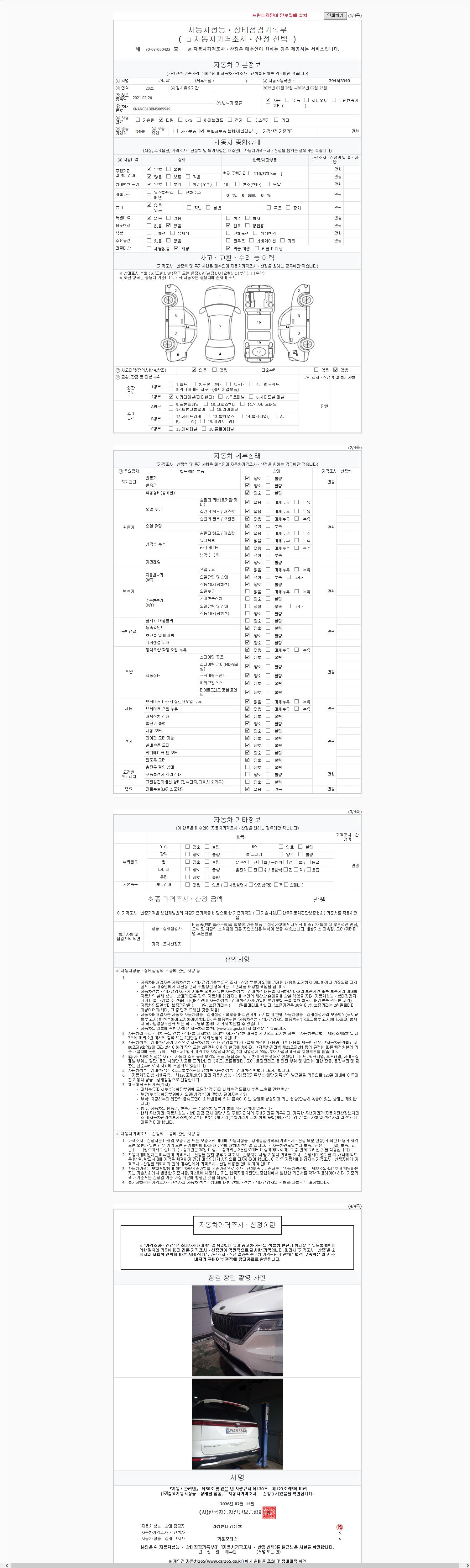 | 주행거리 | 110,773 km | 차량번호 | 394서3340 | 사고유무 | 성능기록부 참조 | 제시번호 | 제 2147483647 호 |